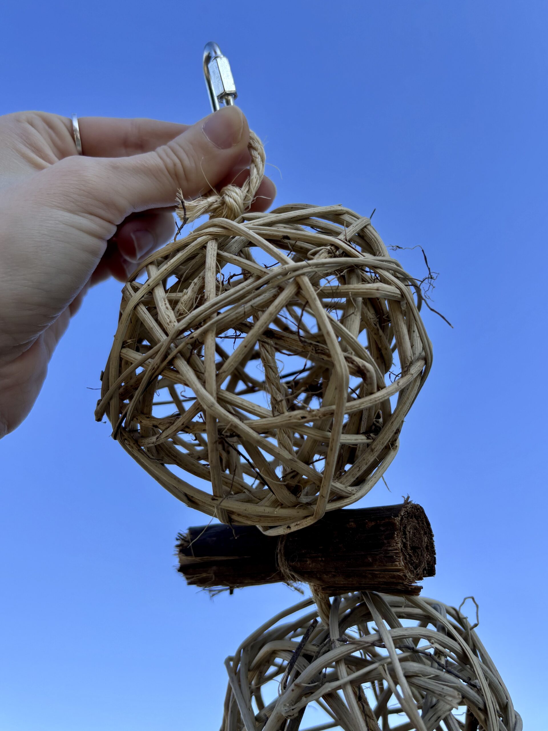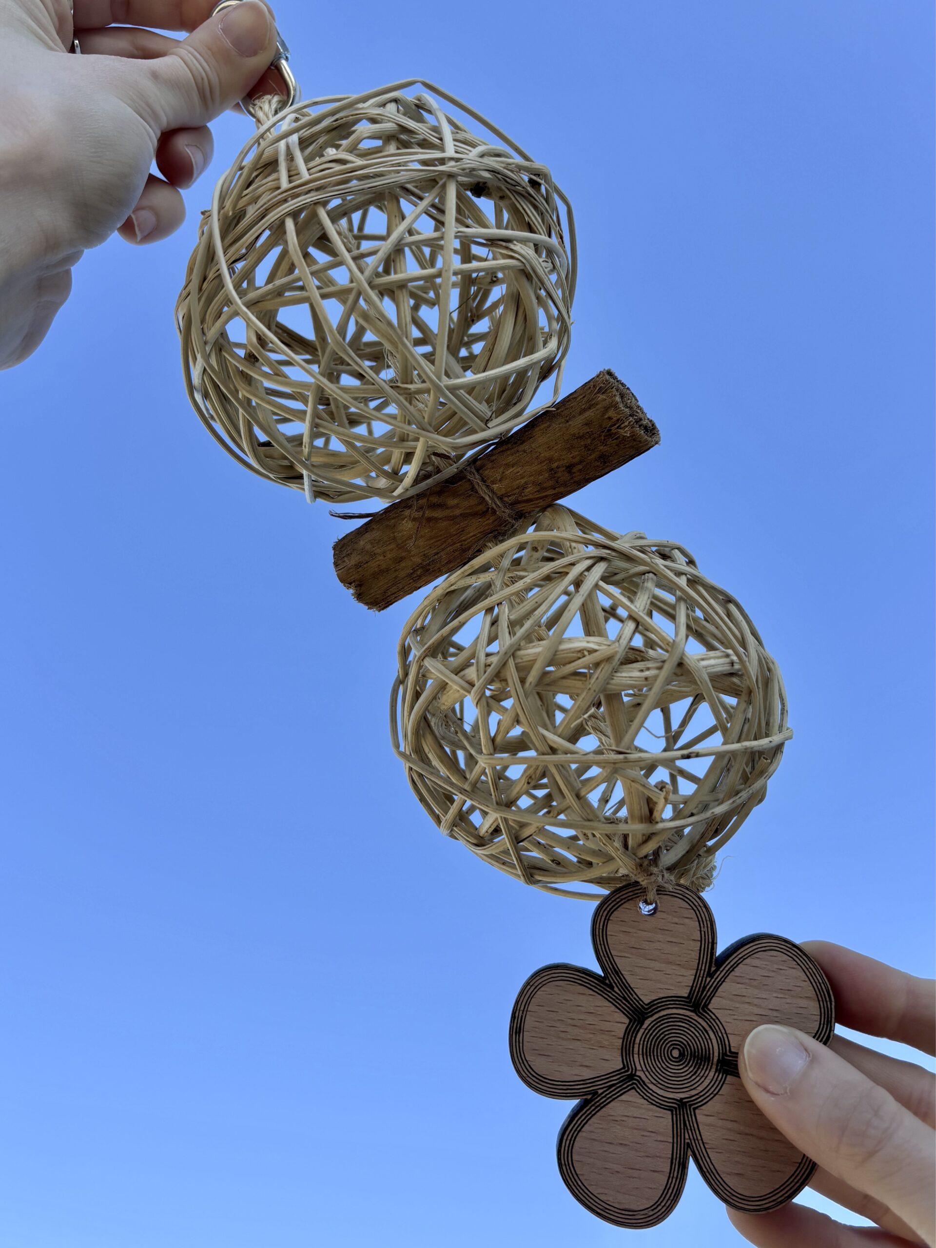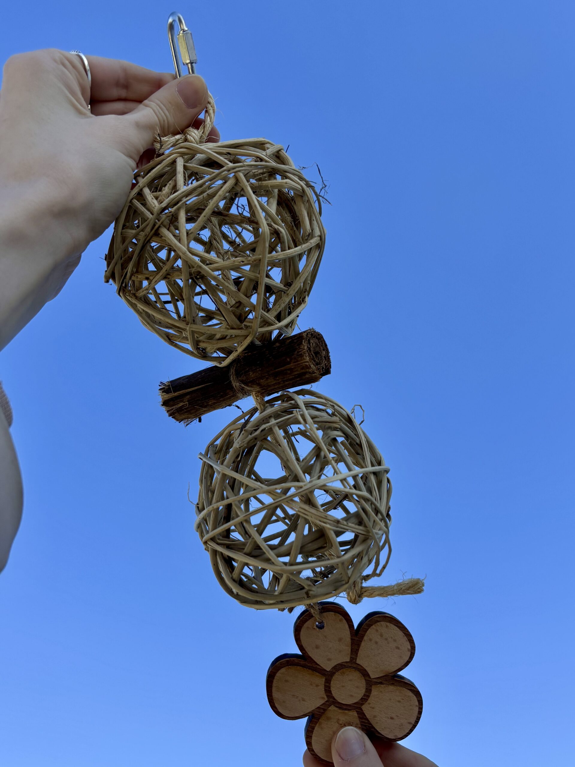 È composto da corda di canapa, palle in rattan, rotoloni di palma e decorazione in legno di faggio. Le palle di rattan sono utili per inserire spighe, rametti e verdura per far divertire il vostro amico pappagallo. Le decorazioni in legno sono realizzate da noi con legno massello spesso 1cm non multistrato, quindi prive di ogni tipo di colla, rifinite a mano singolarmente per eliminare spigoli e garantire maggiore sicurezza durante il gioco. Il gioco può essere agganciato alla voliera tramite il moschettone a vite in acciaio, sicuro per i vostri amici pappagalli.