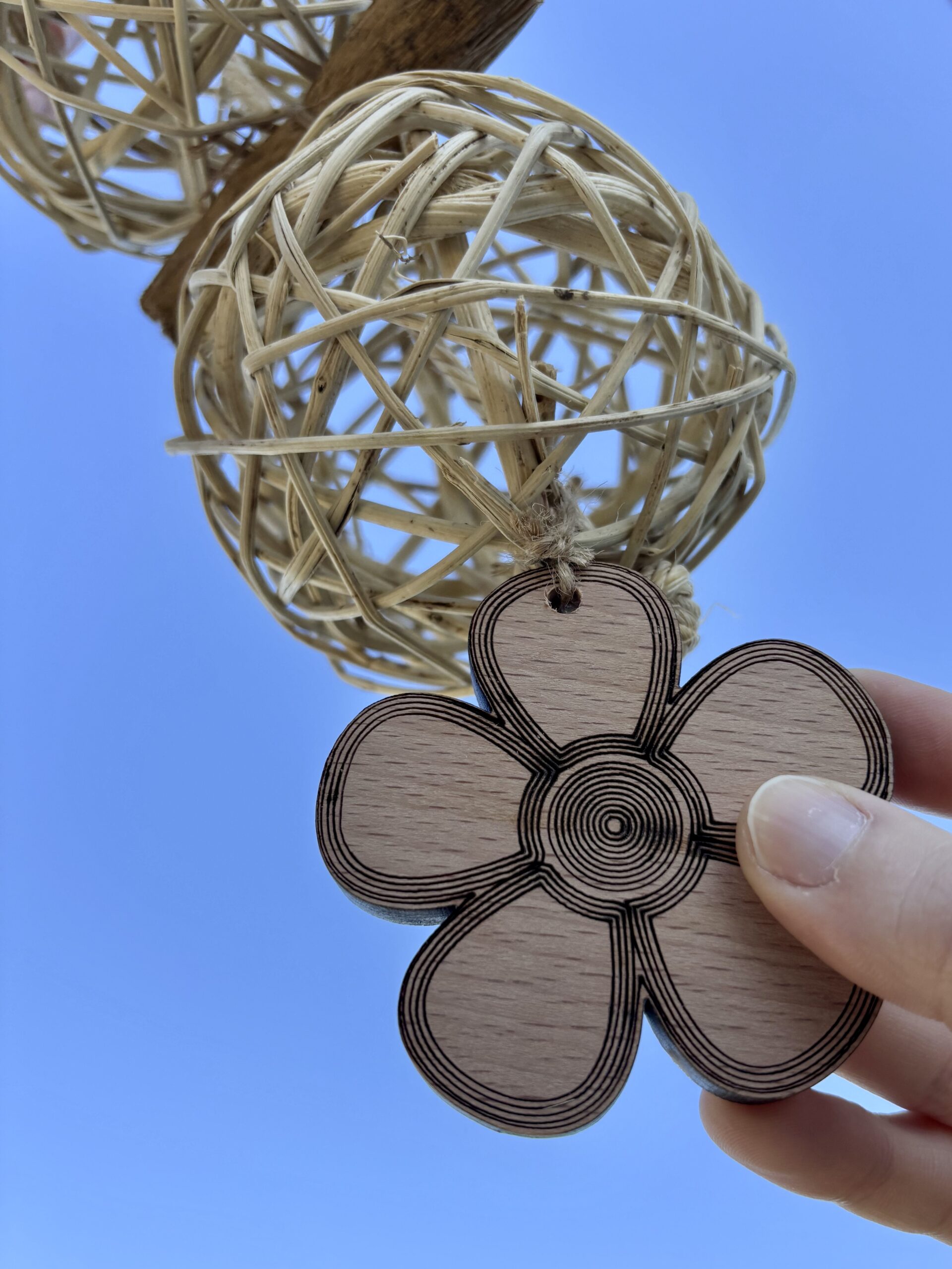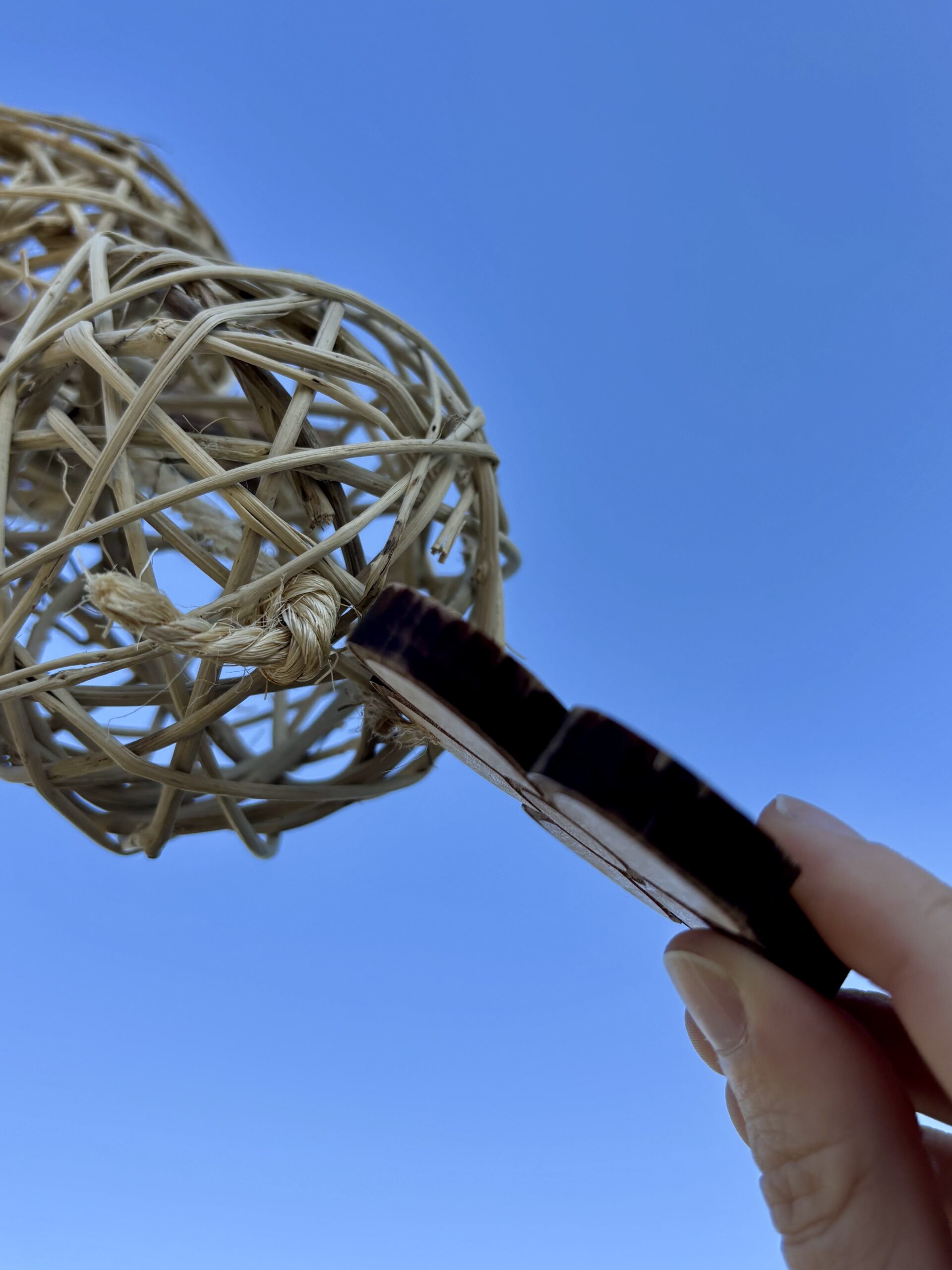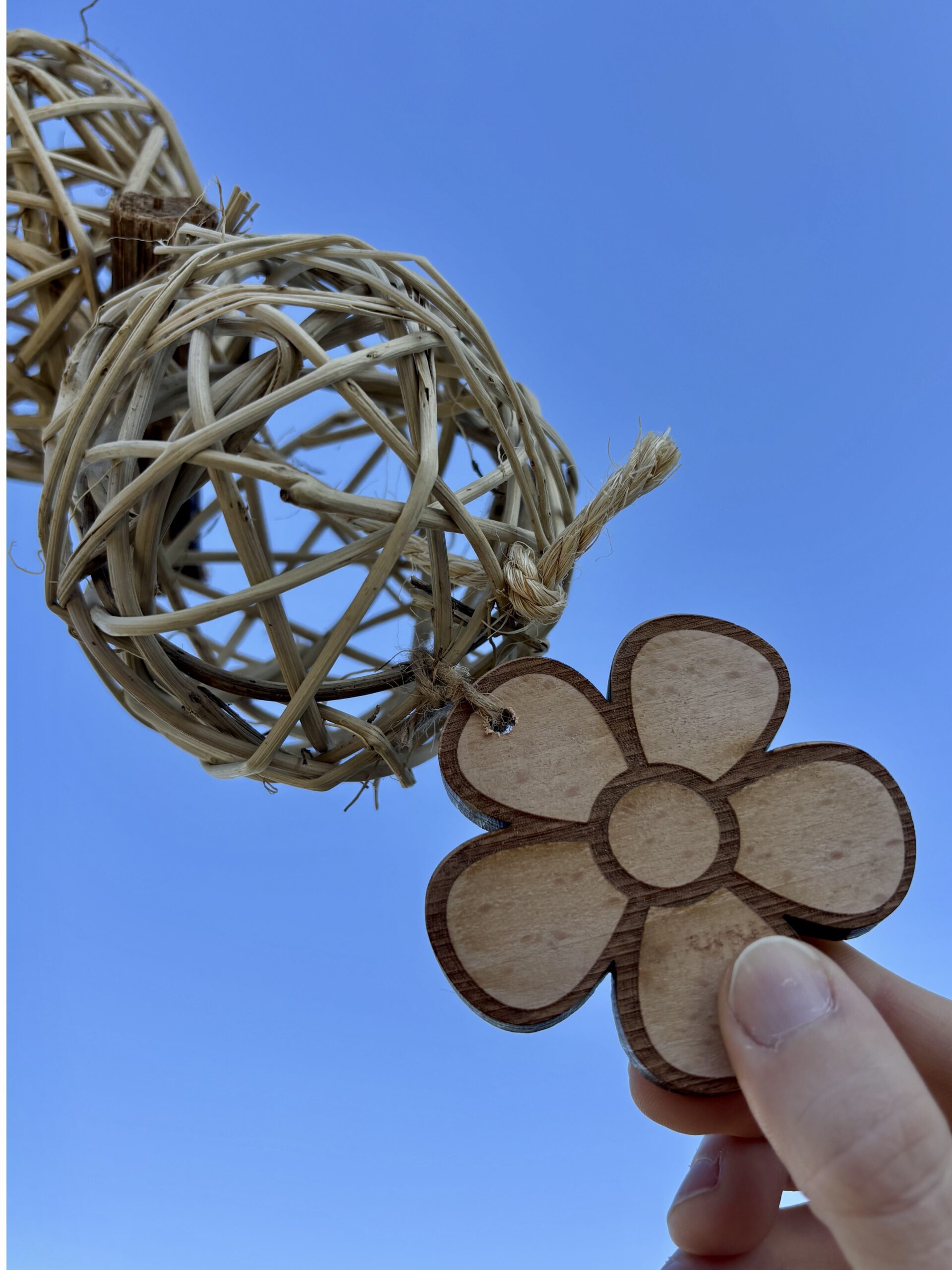 È composto da corda di canapa, palle in rattan, rotoloni di palma e decorazione in legno di faggio. Le palle di rattan sono utili per inserire spighe, rametti e verdura per far divertire il vostro amico pappagallo. Le decorazioni in legno sono realizzate da noi con legno massello spesso 1cm non multistrato, quindi prive di ogni tipo di colla, rifinite a mano singolarmente per eliminare spigoli e garantire maggiore sicurezza durante il gioco. Il gioco può essere agganciato alla voliera tramite il moschettone a vite in acciaio, sicuro per i vostri amici pappagalli.