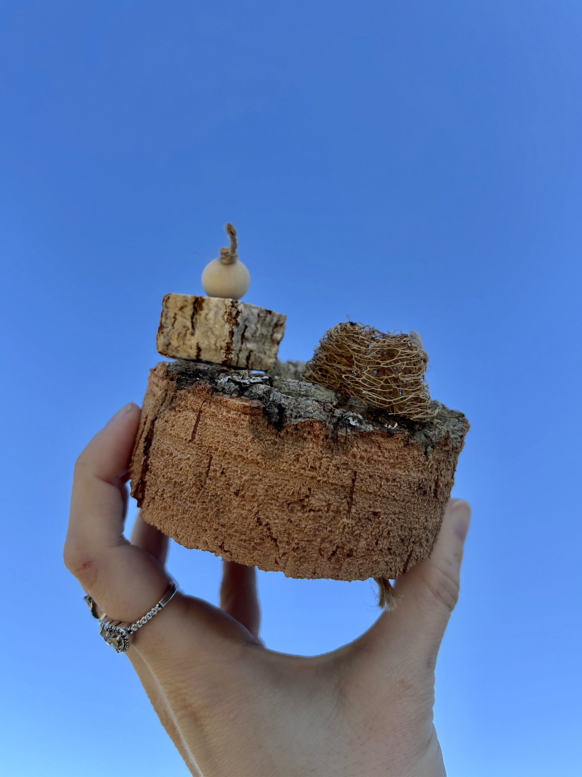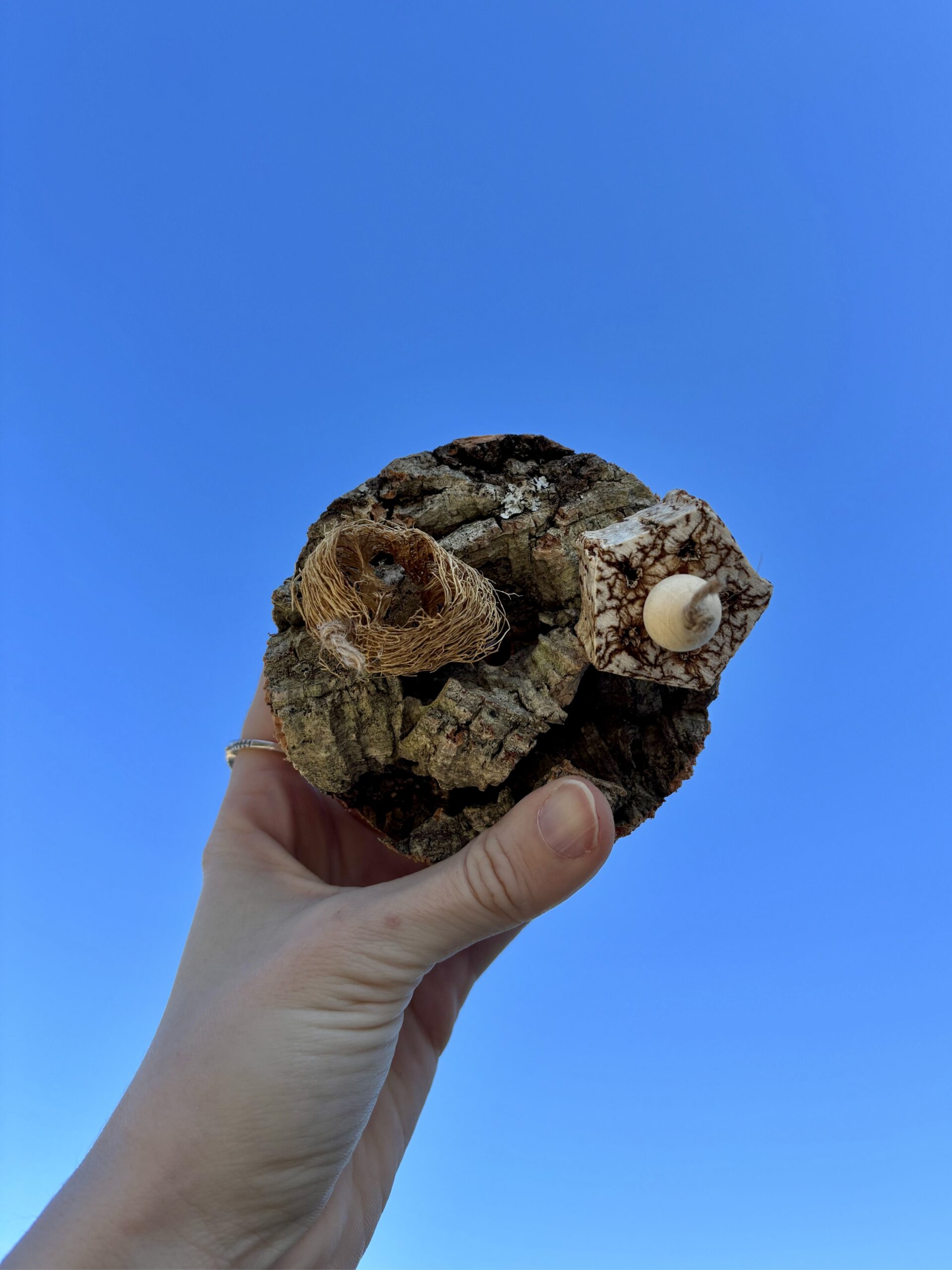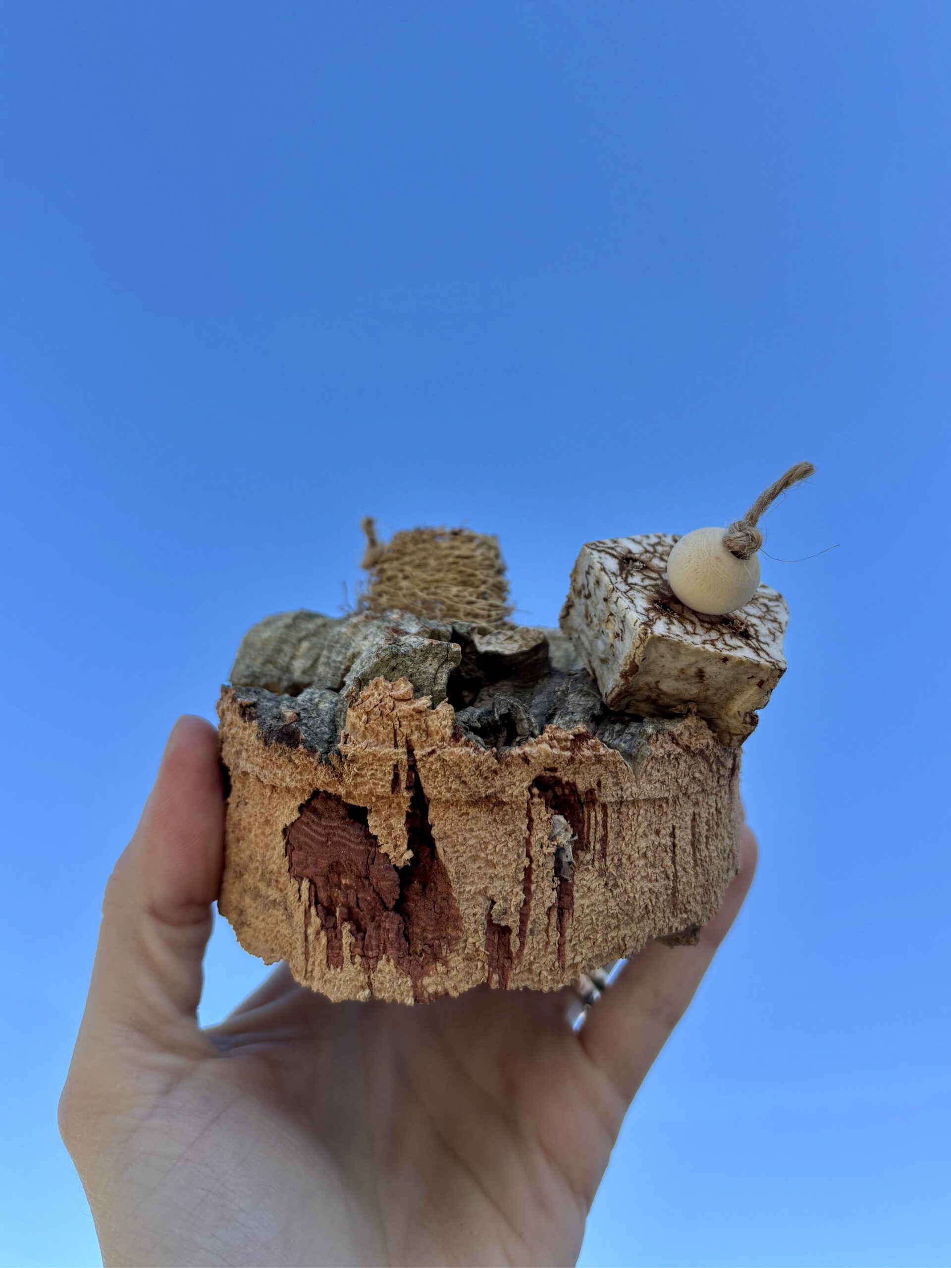 Il gioco è composto da sughero, luffa e da una fetta del frutto secco di mogano infilati su corda di juta. Ogni pezzo è unico e pensato per stimolare il becco, le zampe e la curiosità del pappagallo, contribuendo all’arricchimento ambientale e al suo benessere quotidiano.