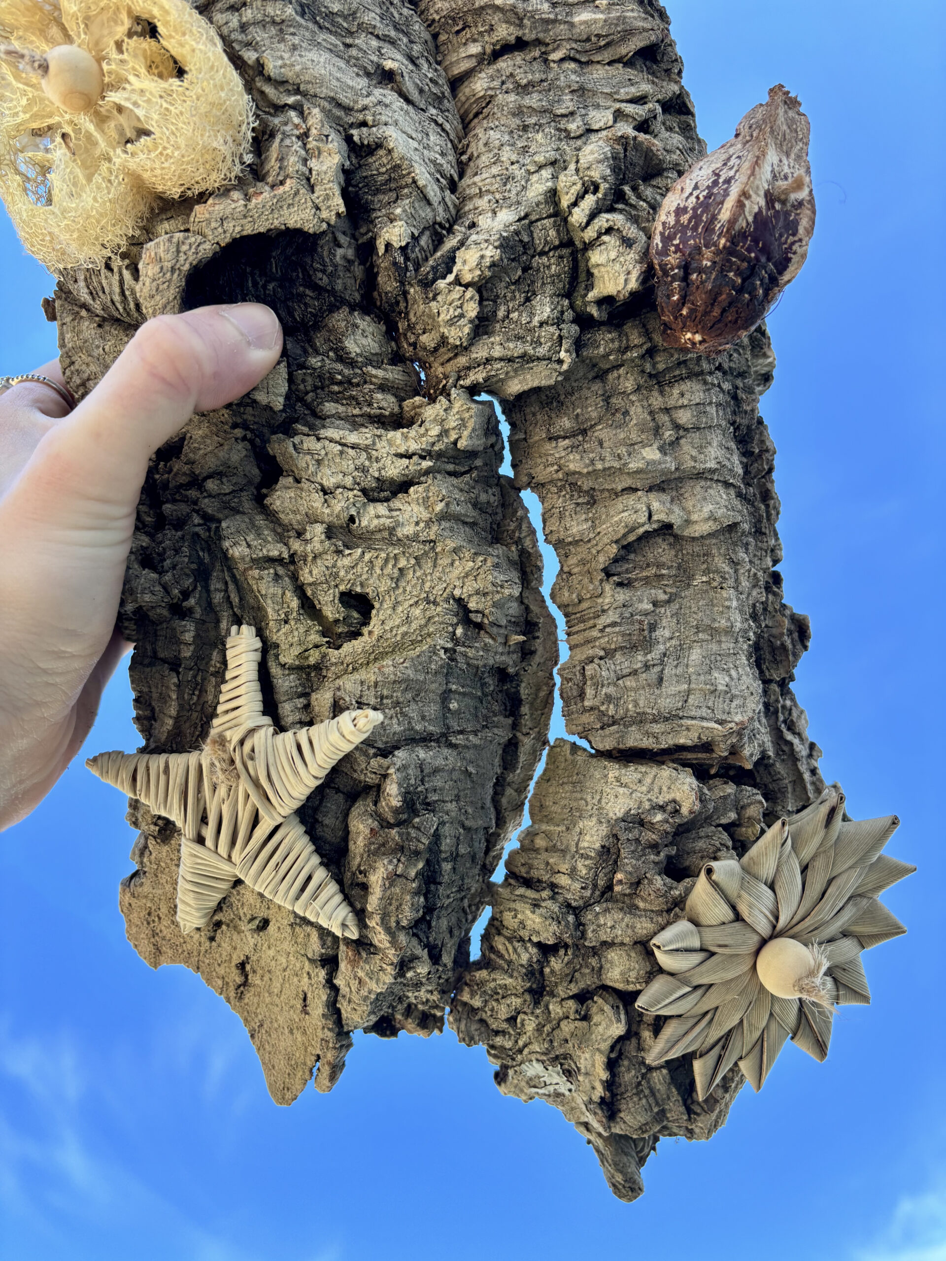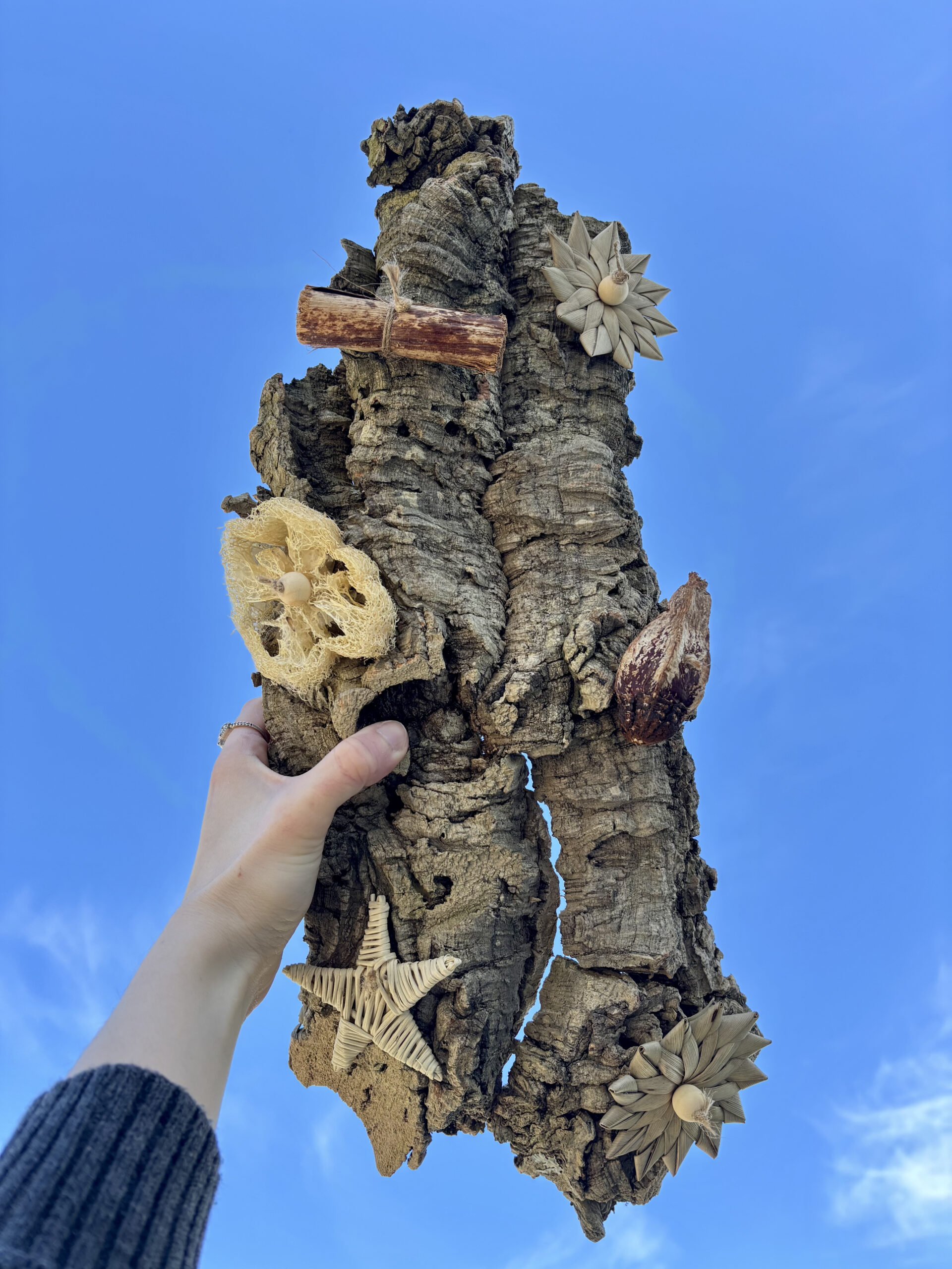 Il prodotto è composto da un grande pezzo in sughero dove sulla lunghezza sono presenti luffa, rotolino di platano, stella in rattan, palline di pino, fiori di foglie di palma e frutto secco di mogano. Il pannello è pensato per essere appoggiato su superfici piane in modo da poterlo utilizzare come base per le attività di foraging, le increspature sono infatti perfette per spargere semi e premietti!