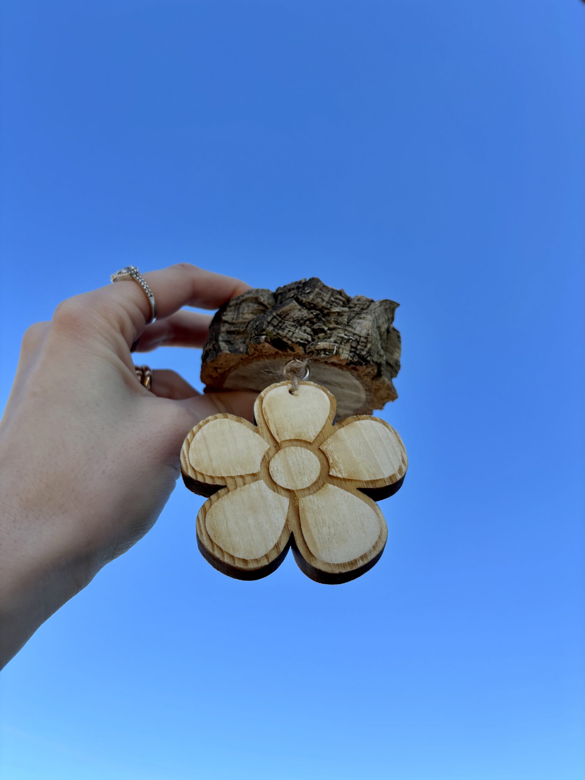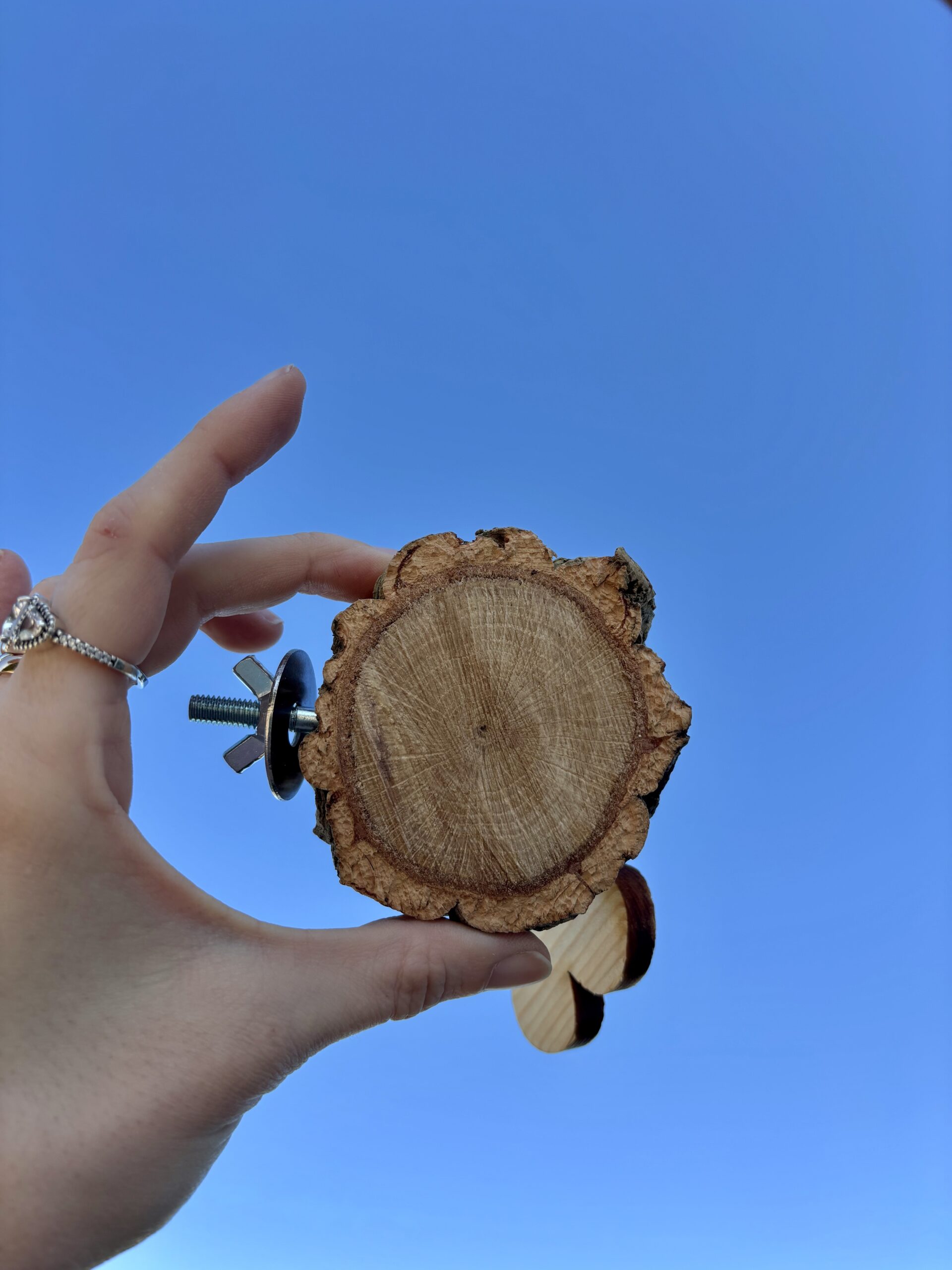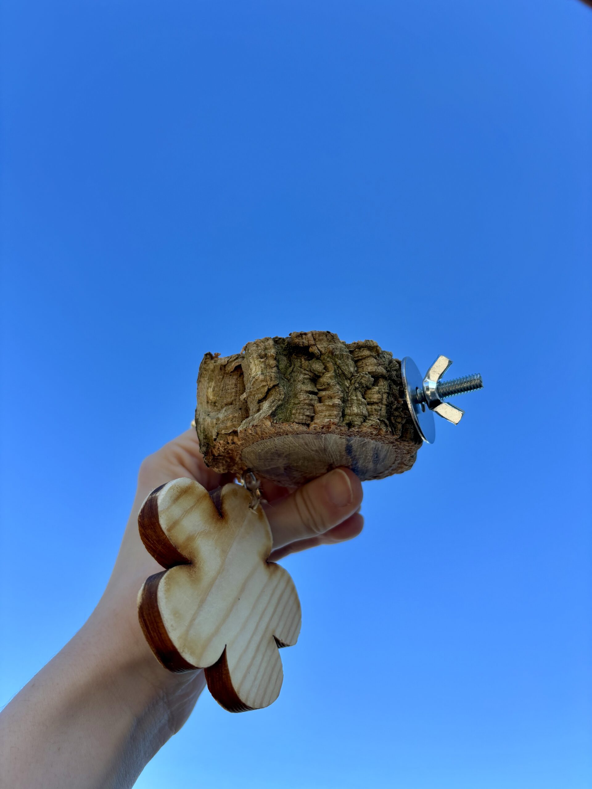 È composto da un piccolo disco di quercia con agganciata una decorazione in legno di pino. Le decorazioni in legno sono realizzate da noi con legno massello spesso 1cm non multistrato, quindi prive di ogni tipo di colla, rifinite a mano singolarmente per eliminare spigoli e garantire maggiore sicurezza durante il gioco. Ogni pezzo è unico e pensato per stimolare il becco, le zampe e la curiosità del pappagallo, contribuendo all’arricchimento ambientale e al suo benessere quotidiano.