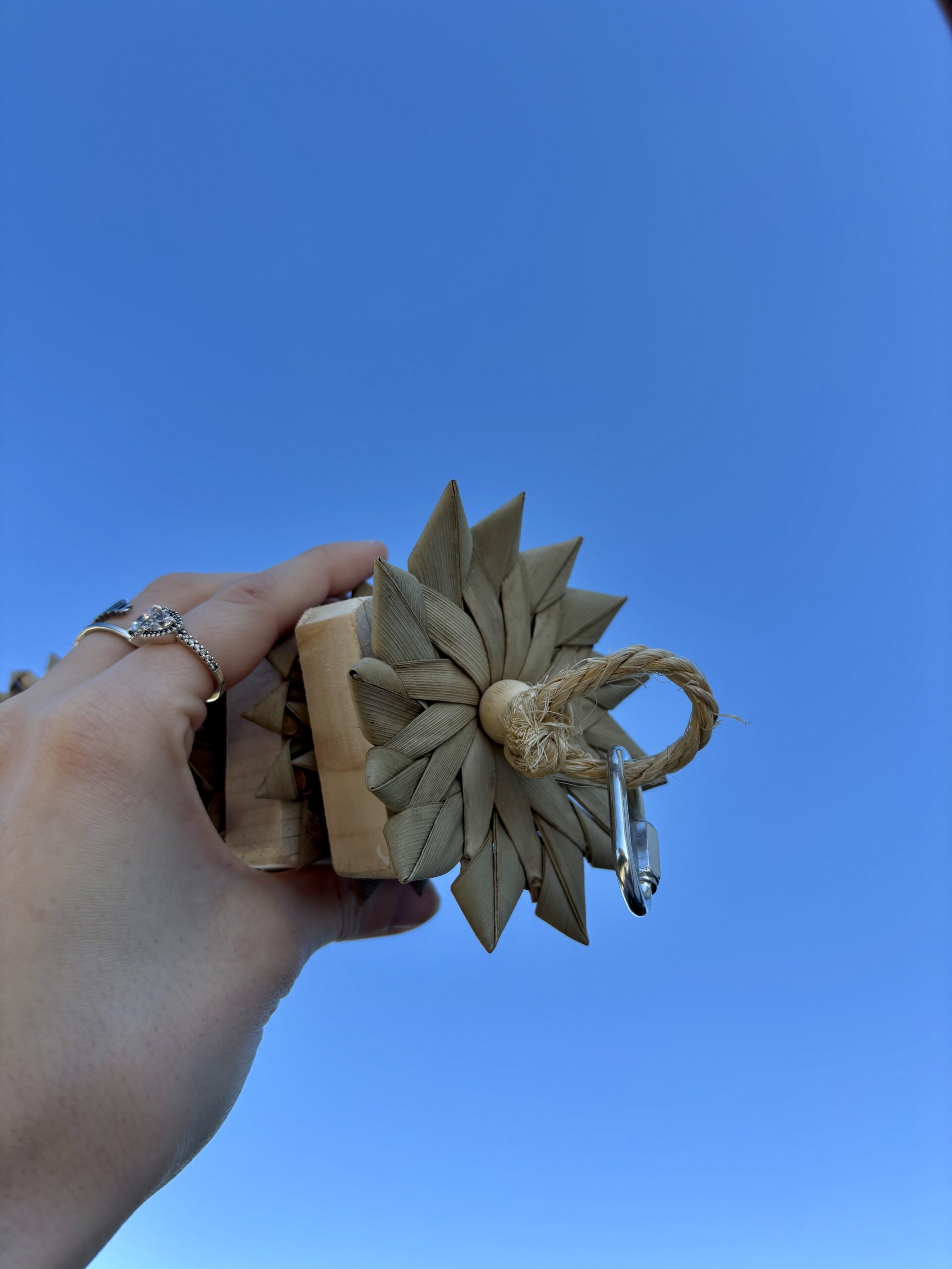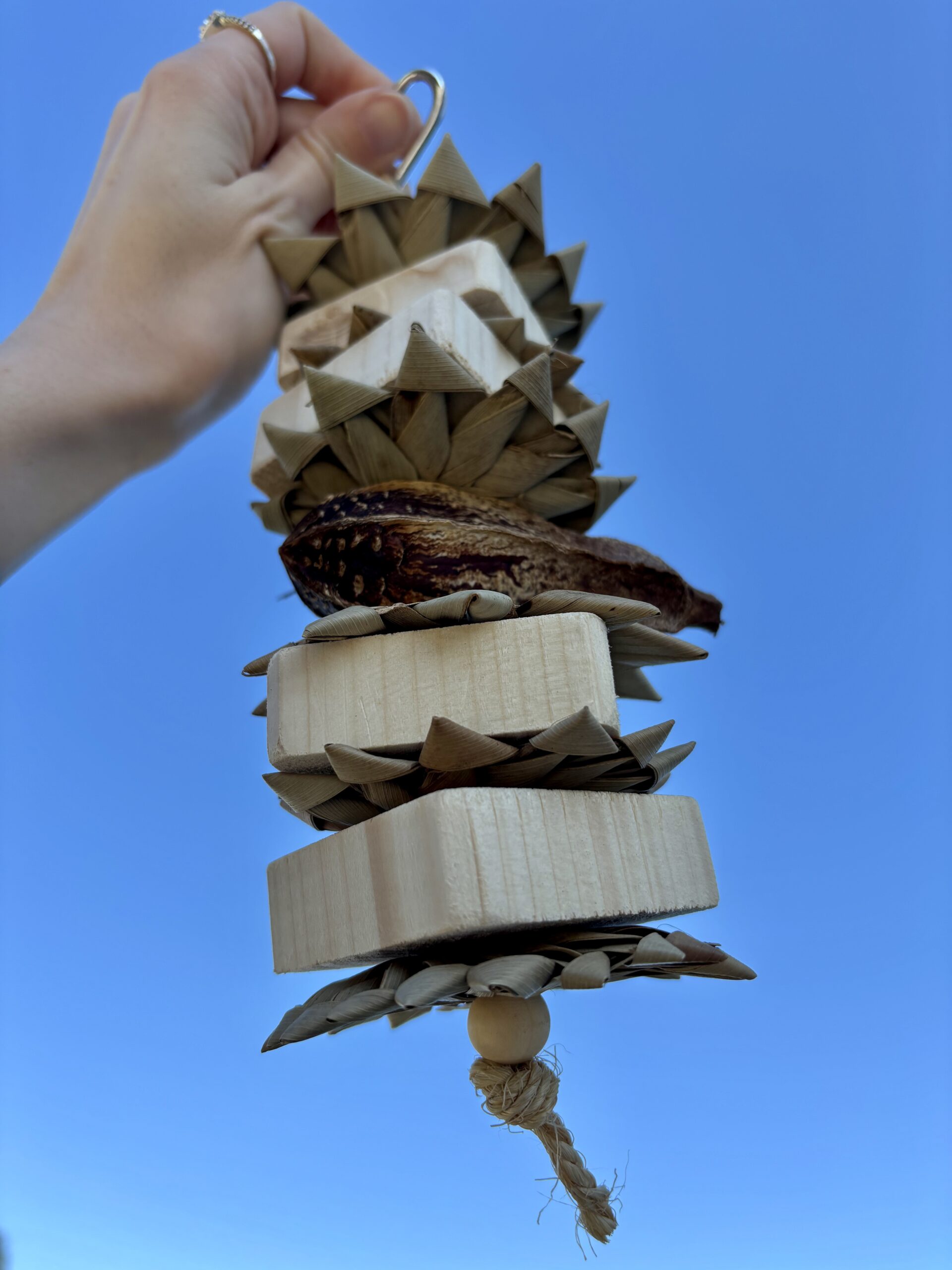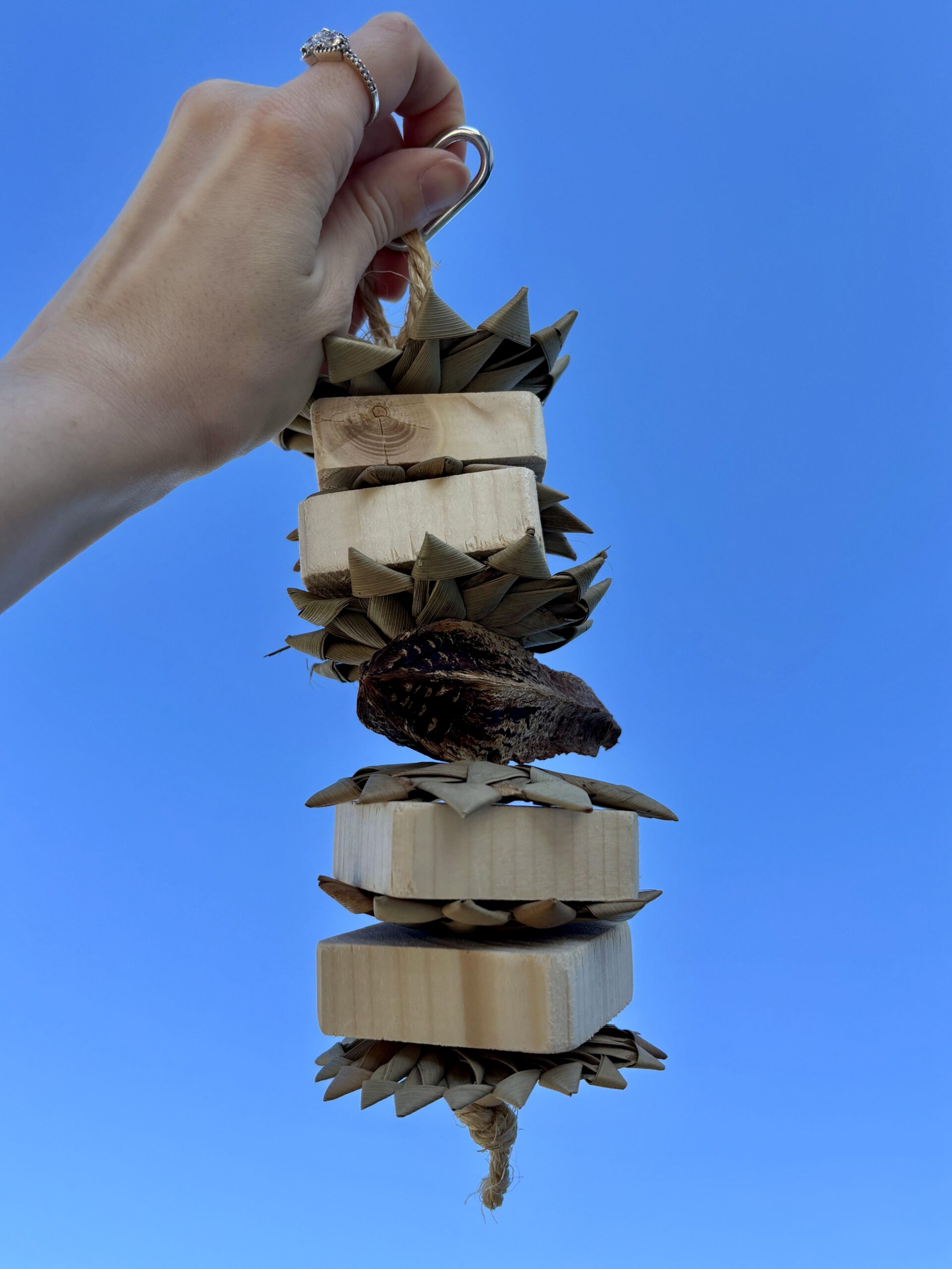 Il gioco è composto da cubetti in abete, fiori di foglie di palma e frutto secco di mogano collegati con corda di canapa. Il gioco è agganciabile alla voliera tramite moschettone a vite in acciaio, sicuro per l’utilizzo da parte dei vostri amici pappagalli. Ogni pezzo è unico e pensato per stimolare il becco, le zampe e la curiosità del pappagallo, contribuendo all’arricchimento ambientale e al suo benessere quotidiano.