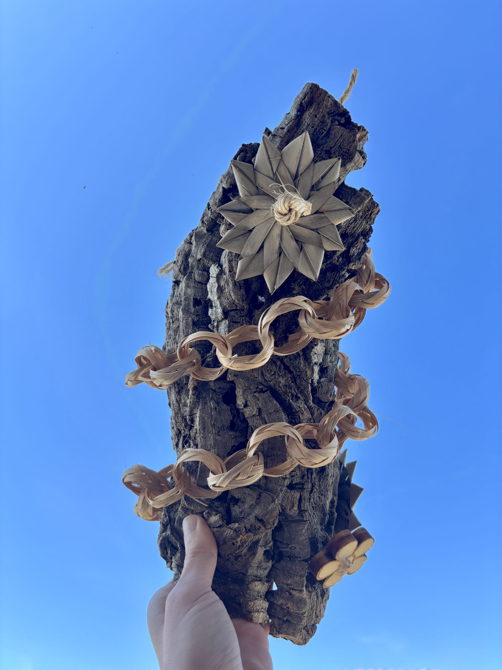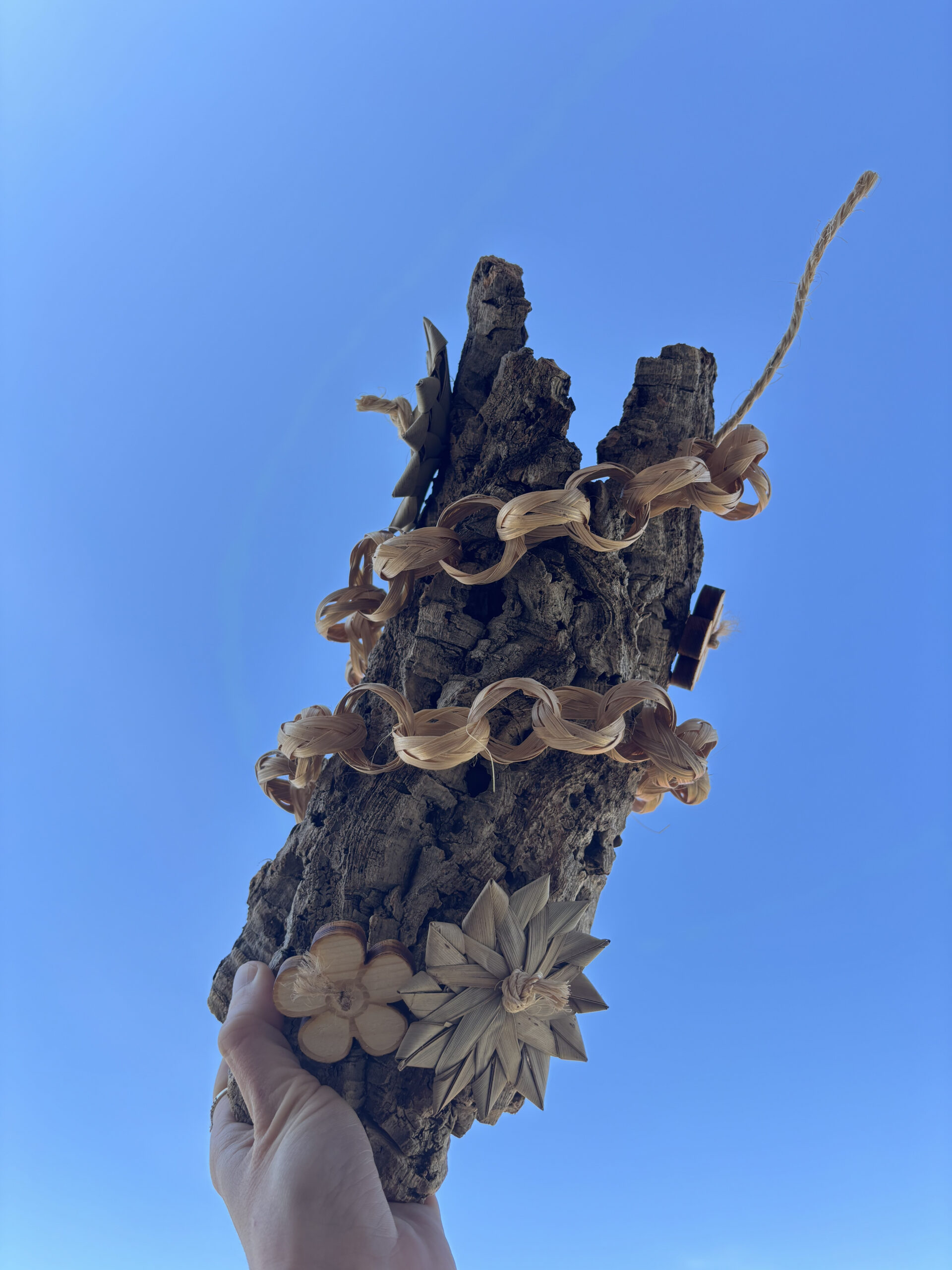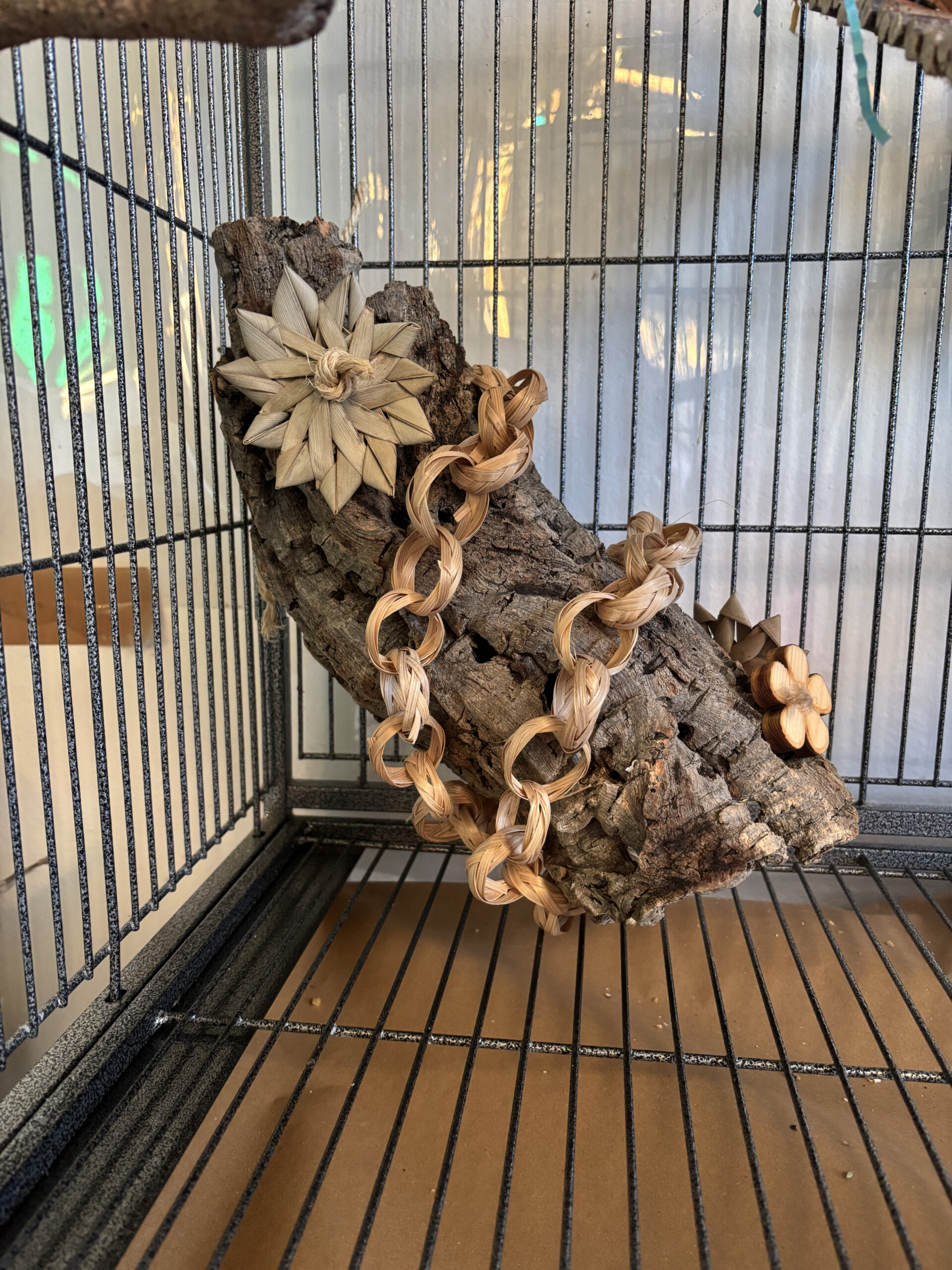 Il prodotto è composto da un tunnel in sughero, pensato per essere appoggiato sul fondo della gabbia o appeso tramite corda di canapa. Sulla lunghezza sono presenti catena di bambù, fiori di palma, decorazioni in legno di pino per stimolare ancora di più i vostri amici pappagalli! Le decorazioni in legno sono realizzate da noi con legno massello spesso 1cm non multistrato, quindi prive di ogni tipo di colla, rifinite a mano singolarmente per eliminare spigoli e garantire maggiore sicurezza durante il gioco.